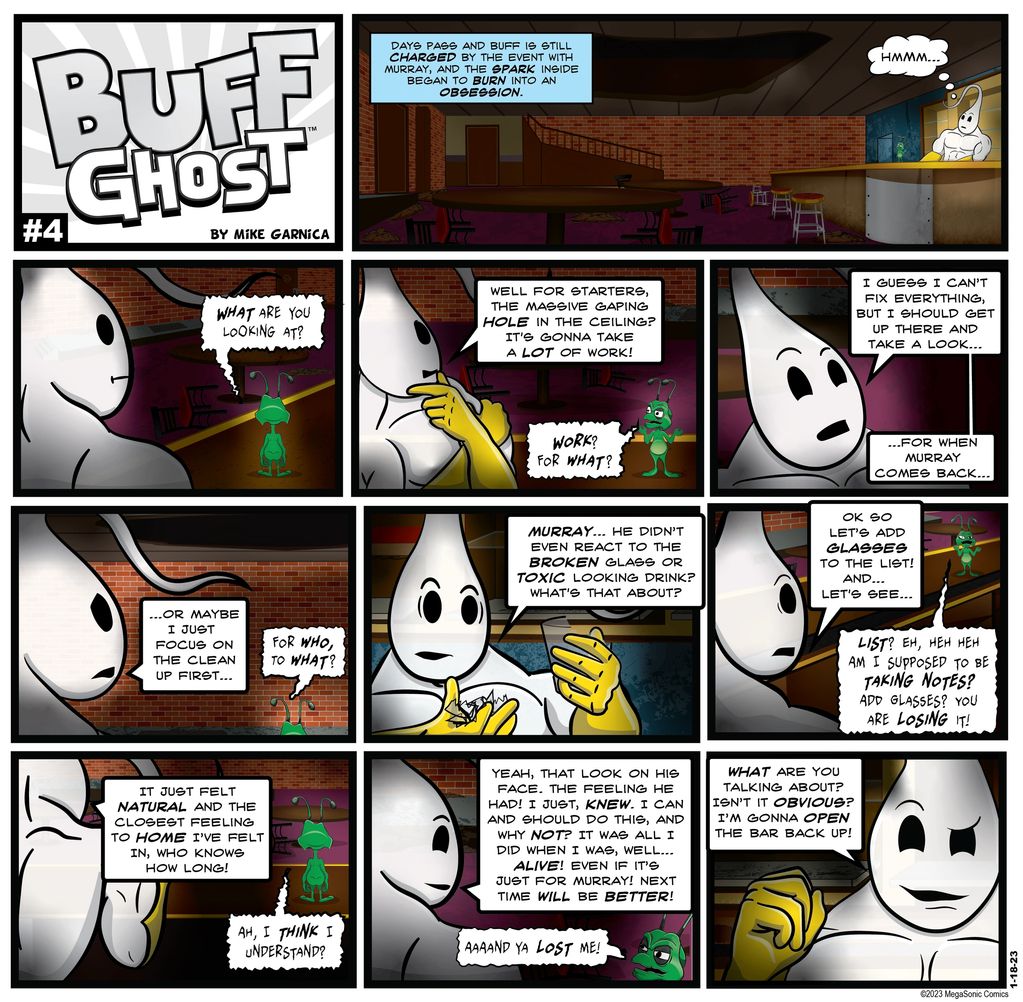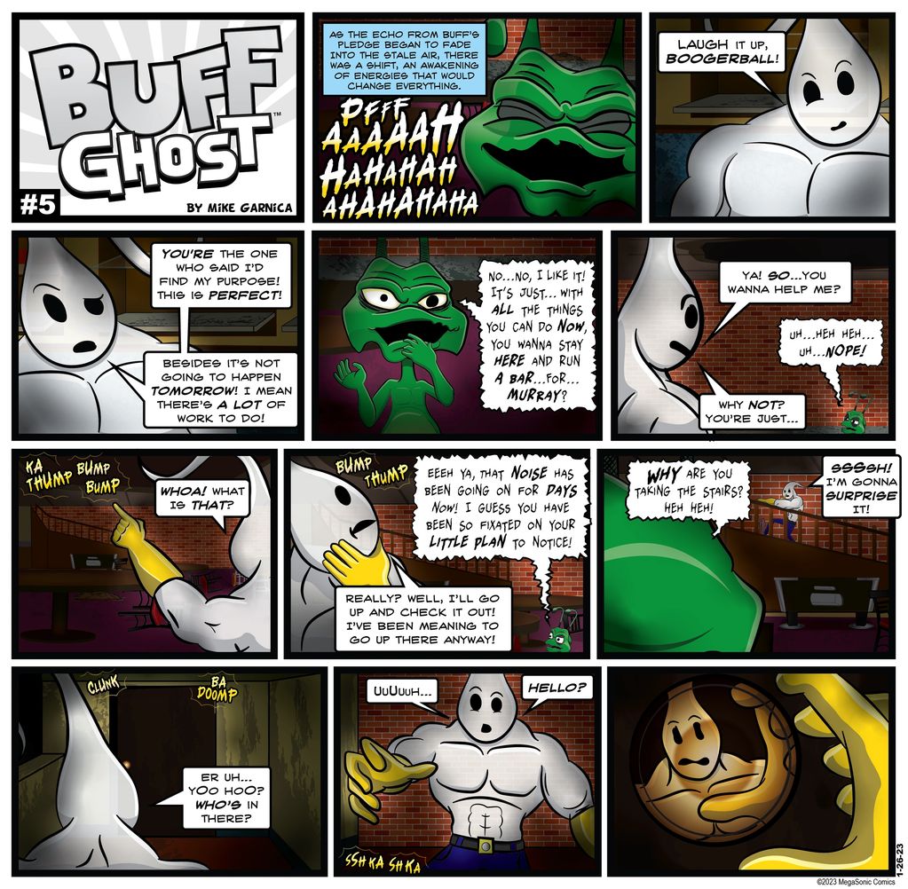 From the depths of a depression, for who knows how long, a sudden burst of noise and energy awakens Buff from his doldrums...